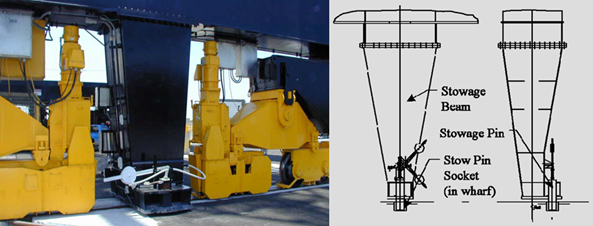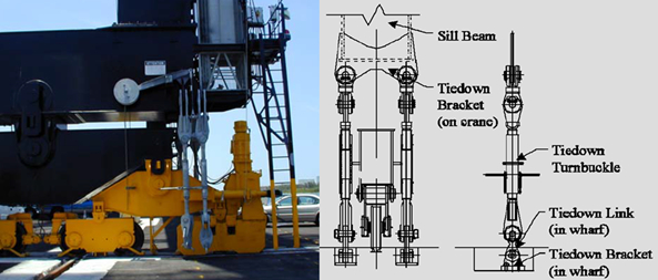 - storm(stowage) pin 시스템은 storm(stowage) pin과 pin socket으로 구성되며, storm(stowage) pin은 크레인 해측 및 육측 sill beam의 중앙 아래에 설치되고 pin socket은 에이프런 표면에 시공됨 - tie-down 시스템은 tie-down 연결 장치와 anchor point로 구성되며, tie-down 연결 장치는 크레인의 네 모서리에 설치되고 anchor point는 에이프런 표면에 시공됨 - 크레인의 storm(stowage) pin을 에이프런의 pin socket에 삽입함으로써 주차된 크레인을 갠트리 주행 방향으로 이동하지 않도록 고정하고, 크레인의 tie-down 연결 장치를 에이프런의 anchor point에 결속함으로써 주차된 크레인의 leg가 레일에서 분리되지 않도록 고정함 - storm(stowage) pin 시스템과 tie-down 시스템은 가해지는 최대 예측력을 견딜 수 있도록 설계되어야 함