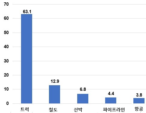 - 올 1월 미국의 총화물운송가액은 910억달러이며 이중 트럭운송 화물가액이 631억달러로 69%, 철도운송 화물가액이 129억달러로 14%를 차지해 철도운송 분담율이 상당히 높은 반면 해상운송 분담율은 7.4%에 불과함