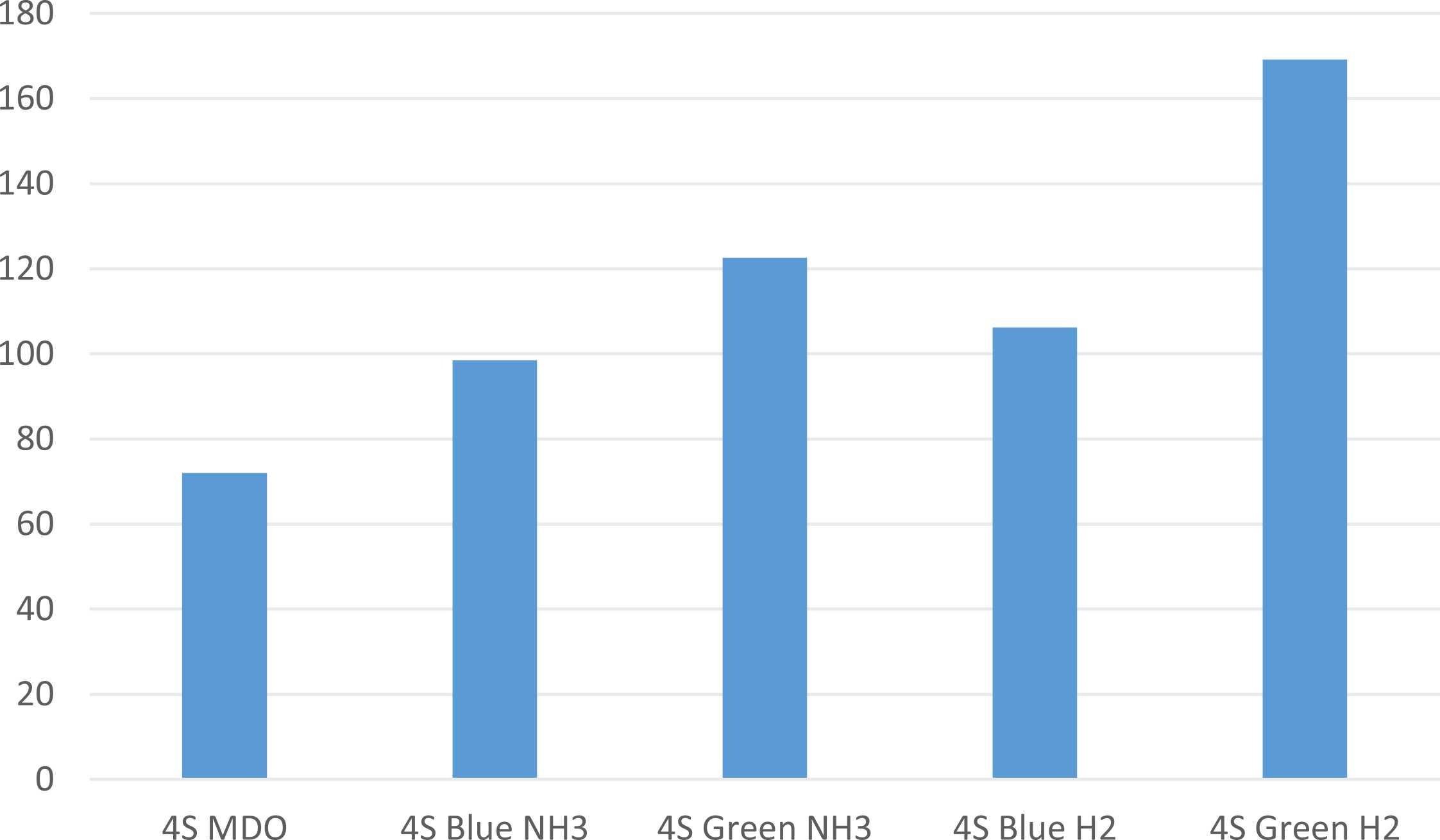 그림1. 4-Stroke 기준 수소 및 암모니아 연료의 선박 운용 중 비용