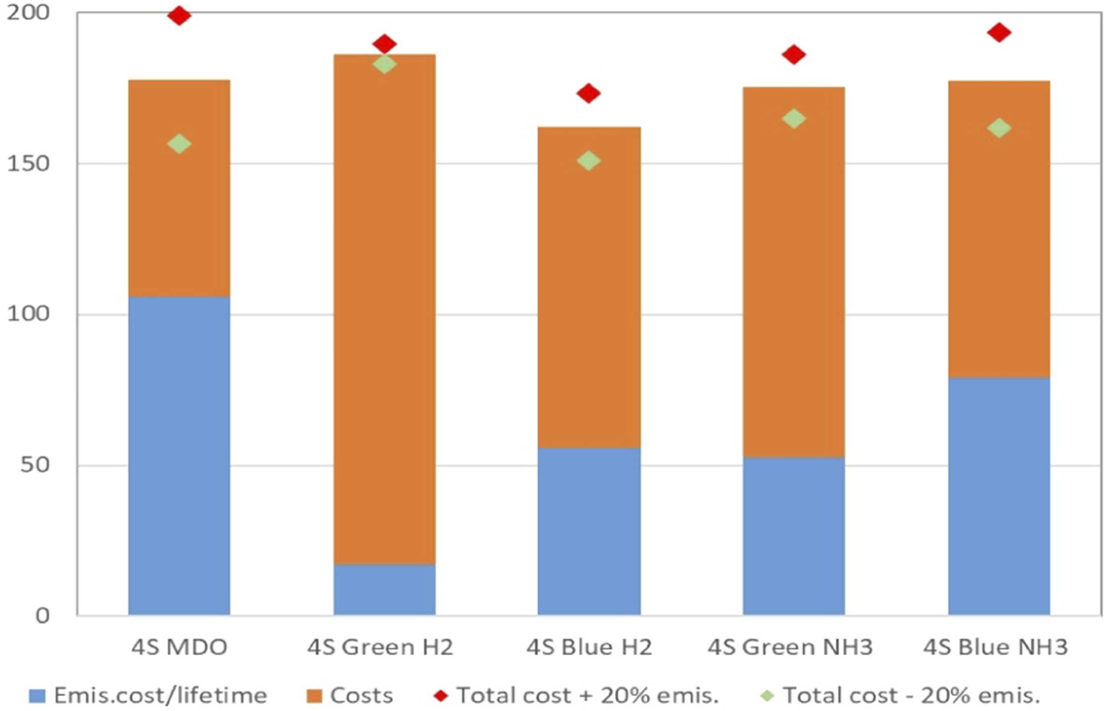 그림2. 4-Stroke 기준 수소 및 암모니아 연료 사용 시 총 비용