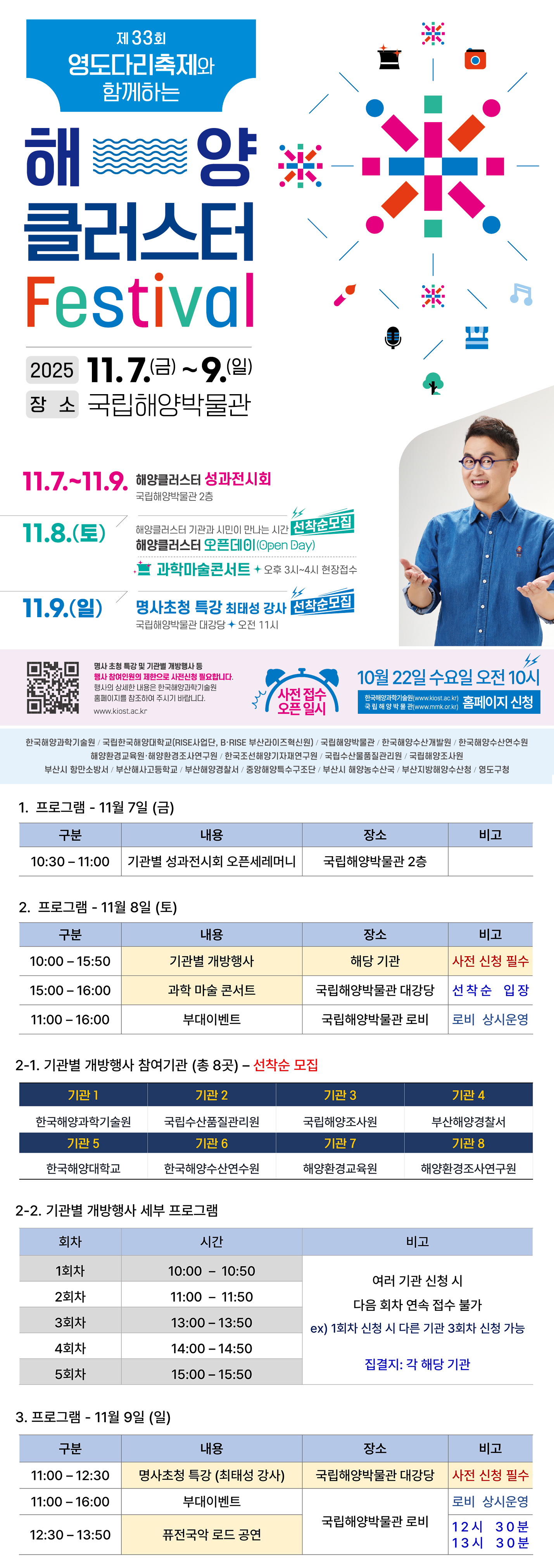 제33회 영도다리축제와 함께하는 해양클러스터Festival 기간 : 2025년 11월 7일(금) ~ 9일(일) 🔹 11.7(금) 기관별 성과전시회 오픈 세리머니 (10:30, 국립해양박물관 2층) 🔹 11.8(토) 해양클러스터 오픈데이(기관 개방행사) 과학 마술 콘서트 🎩 (15:00~16:00, 대강당) 다양한 부대이벤트 상시 운영 🔹 11.9(일) 명사초청 특강 (최태성 강사, 11:00~12:30) 퓨전국악 로드공연 (12:30~13:50) 🎫 사전신청은 10월 22일(수) 오전 10시부터 👉 국립해양박물관 홈페이지 및 한국해양과학기술원 홈페이지에서 접수하세요! [참가신청 링크] ① 해양클러스터 오픈데이 (11월8일(토) 10:00-15:50 / 회당 50분) ▷기관1 - 한국해양과학기술원 (회차당 30명) https://forms.gle/fU2QW8mvJqqTBUf47 ▷기관2 - 국립수산물품질관리원 (회차당 20명) https://forms.gle/L7kGLZAGjEEDZARz6 ▷기관3 - 국립해양조사원 (회차당 15명) https://forms.gle/TmvHPeKmUDzEvaZx5 ▷기관4 - 부산해양경찰서 (회차당 30명) https://forms.gle/ZyQxzNMuty3uZMJ28 ▷기관5 - 한국해양대학교 (회차당 15명) https://forms.gle/pqHvLBuGSDAsVHP86 ▷기관6 - 한국해양수산연수원 (회차당 15명) https://forms.gle/W6j1t9ECpmxQYvpG7 ▷기관7 - 해양환경교육원 (회차당 35명) https://forms.gle/hnDffLjGF3LpPh8s5 ▷기관8 - 해양환경조사연구원 (회차당 20명) https://forms.gle/Nzd2qC6w5w8QdA1c6 ② 명사초청 특강 - 최태성 강사 (11월9일(일) 11:00-12:30) https://forms.gle/RVuVV4sMEcmTJAix9 ※ 사인회 관련 필독 당일 현장에 한국사능력검정시험 교재 또는 합격증, 최태성 선생님 저서를 소지하신 분 대상으로 현장에서 선착순으로 모집하며, 선착순 30명 마감 시 사인회 참여는 제한됨을 확인했습니다. ※ 무단 불참(노쇼) 시 차기 행사 참여가 제한됩니다. 부득이하게 취소하실 경우, 반드시 사전 전화로 취소 요청 부탁드립니다. ※ 관련 문의는 [051-747-0002]로 연락하여 주시기 바랍니다. |