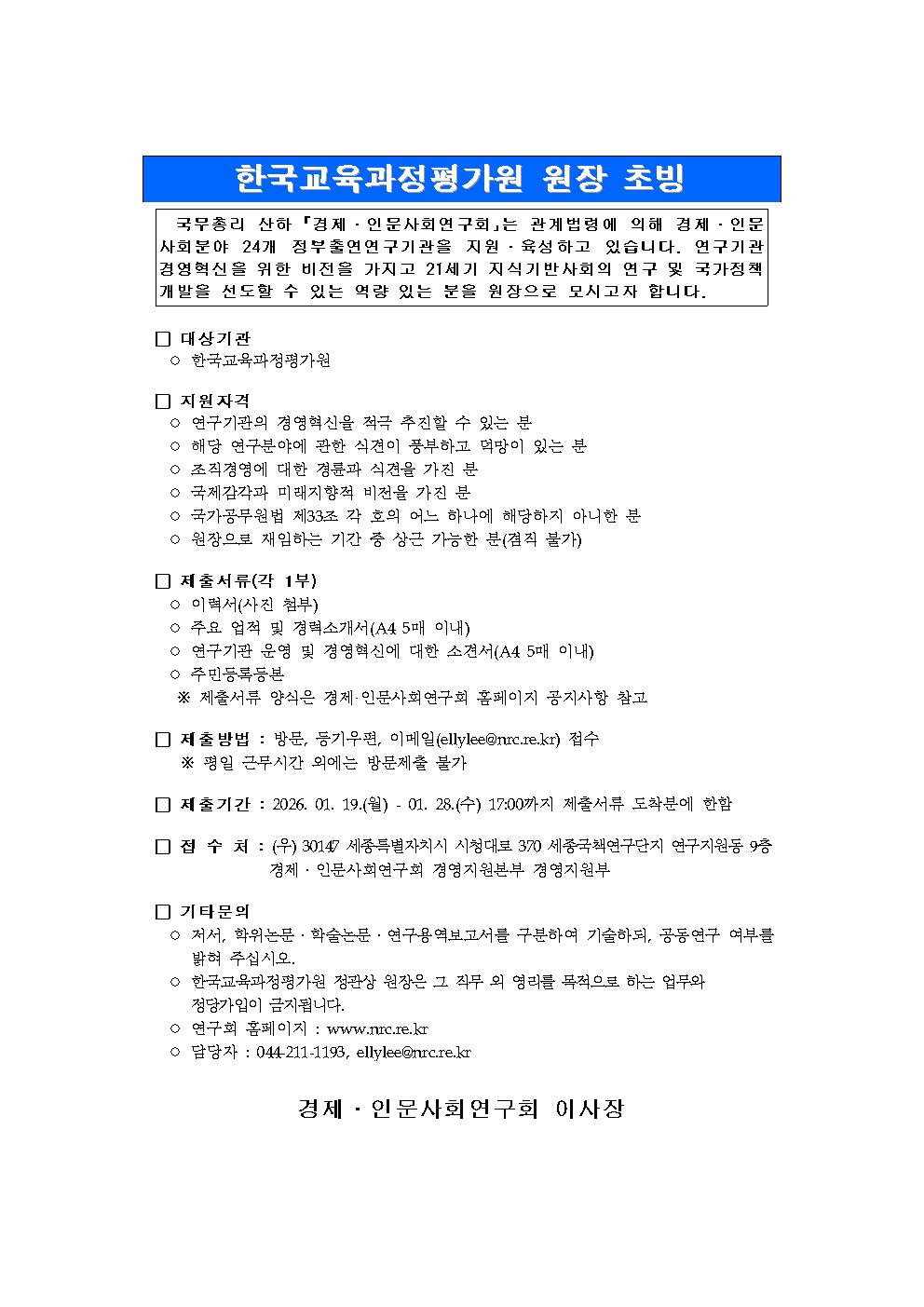 한국교육과정평가원 원장 초빙 국무총리 산하 「경제․인문사회연구회」는 관계법령에 의해 경제․인문사회분야 24개 정부출연연구기관을 지원․육성하고 있습니다. 연구기관 경영혁신을 위한 비전을 가지고 21세기 지식기반사회의 연구 및 국가정책 개발을 선도할 수 있는 역량 있는 분을 원장으로 모시고자 합니다.
