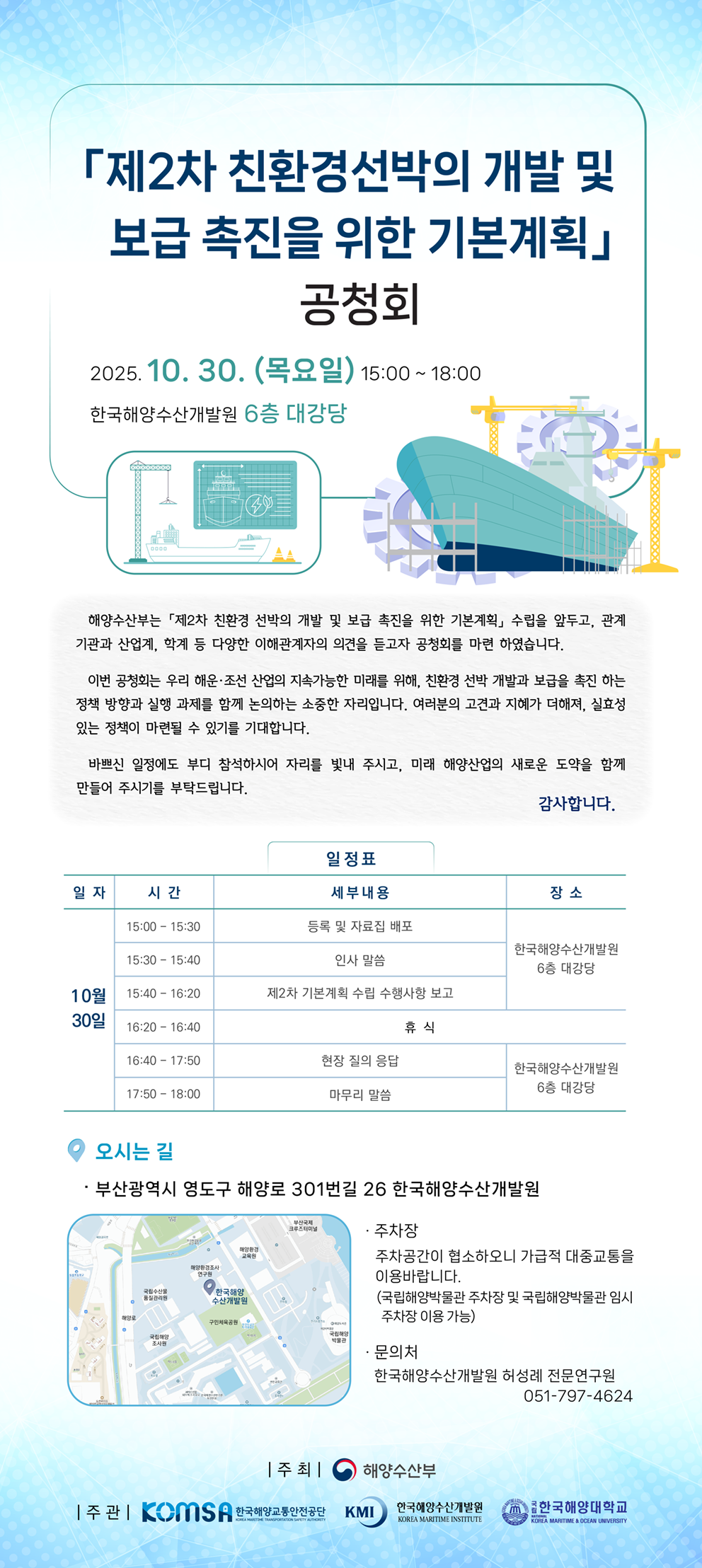 「제2차 친환경선박의 개발 및 보급 촉진을 위한 기본계획」 공청회 일시: 2025년 10월 30일(목) 15:00 ~ 18:00 장소: 한국해양수산개발원 6층 대강당 (부산광역시 영도구 해양로 301번길 26) 주최: 해양수산부 주관: 한국해양교통안전공단(KOMSA), 한국해양수산개발원(KMI), 한국해양대학교 이번 공청회는 친환경 선박 개발 및 보급 촉진을 위한 기본계획 수립에 관한 의견을 청취하는 자리입니다. 해운·조선 산업의 지속가능한 미래를 위해 많은 관심과 참여 부탁드립니다. |